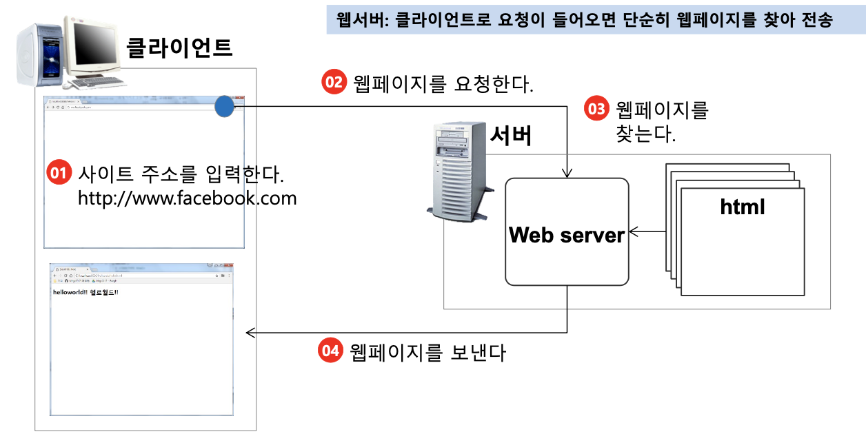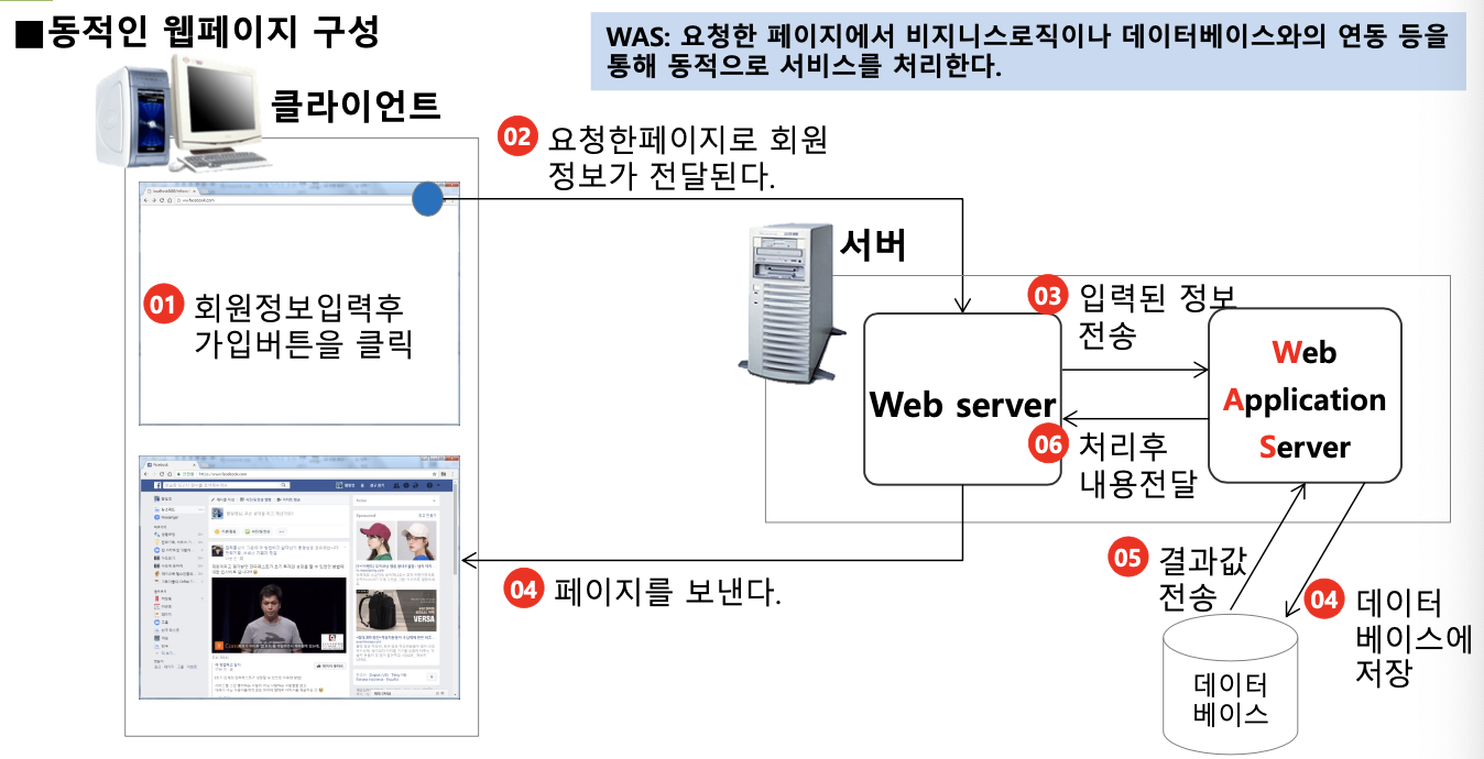 - 웹 서버가 동적인 웹 페이지에 대한 요청을 받으면 서버는 웹 애플리케이션으로 요청을 넘기면 애플리케이션이 HTML 문서를 생성하여 웹 서버로 결과를 전달함