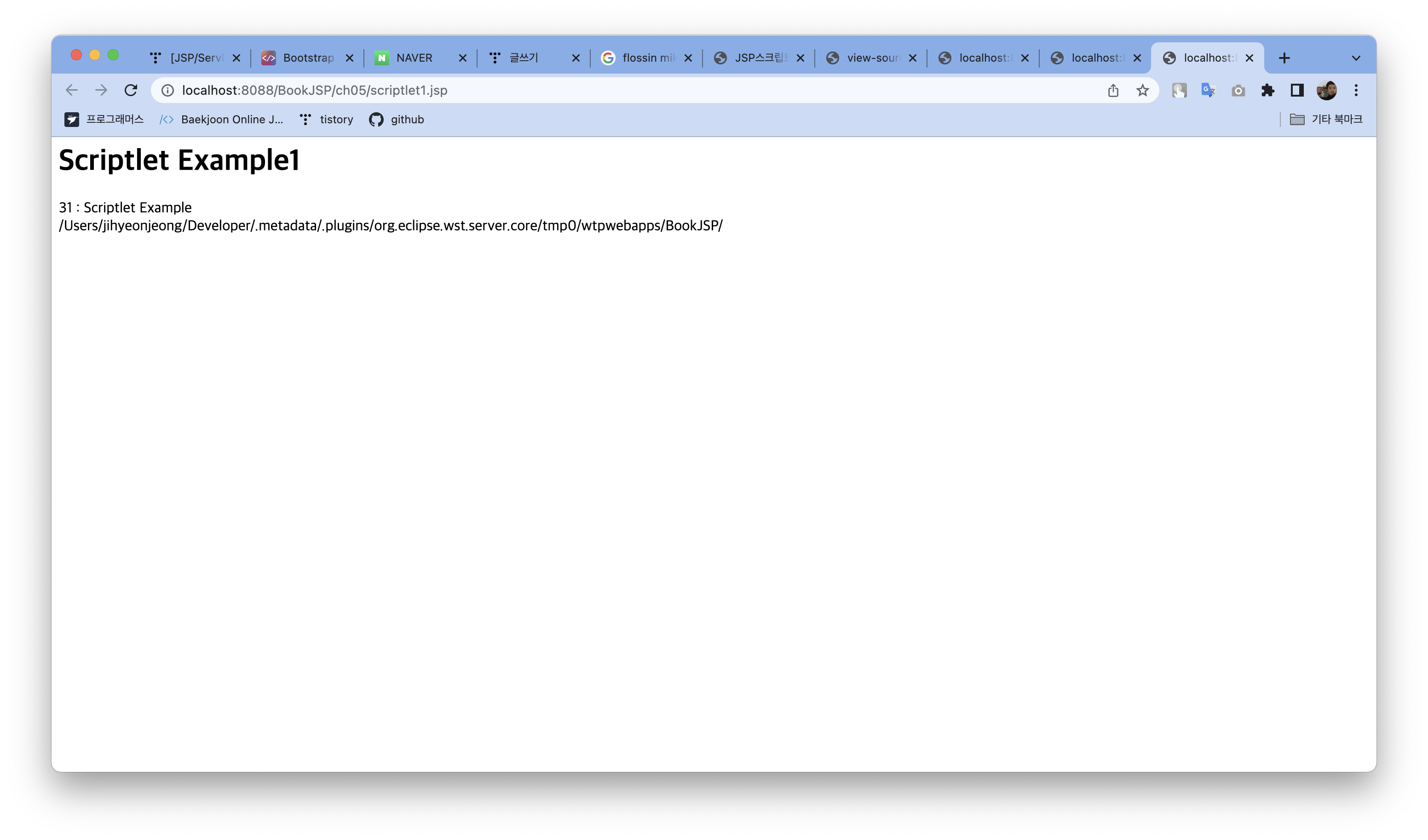 - 스크립트릿은 선언문과 달리 선언된 변수는 지역변수로 선언이 되며 메소드 선언은 할 수 없음