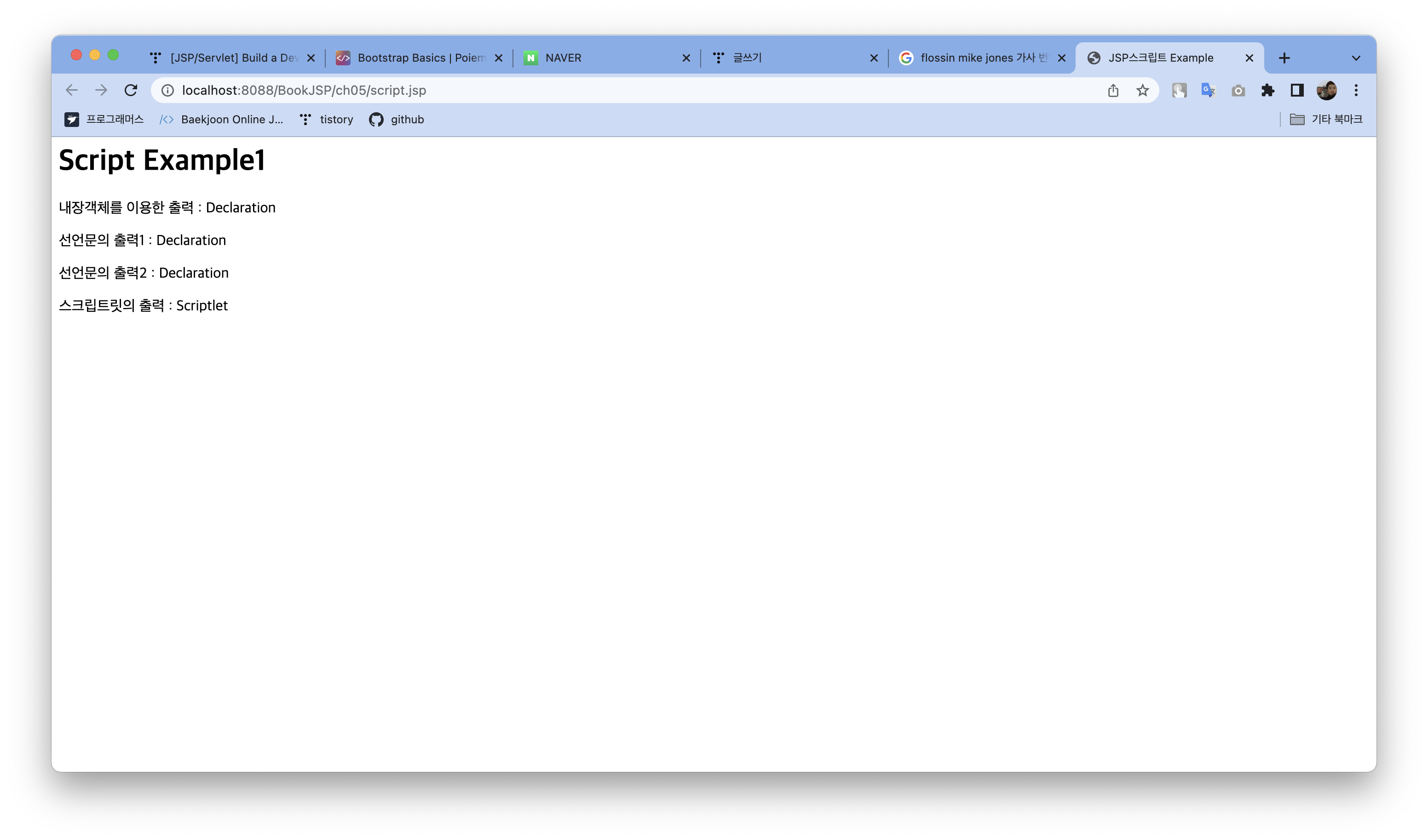 - 스크립트릿 코드 내에서 out이라는 내장객체를 통해 브라우저에 출력 가능