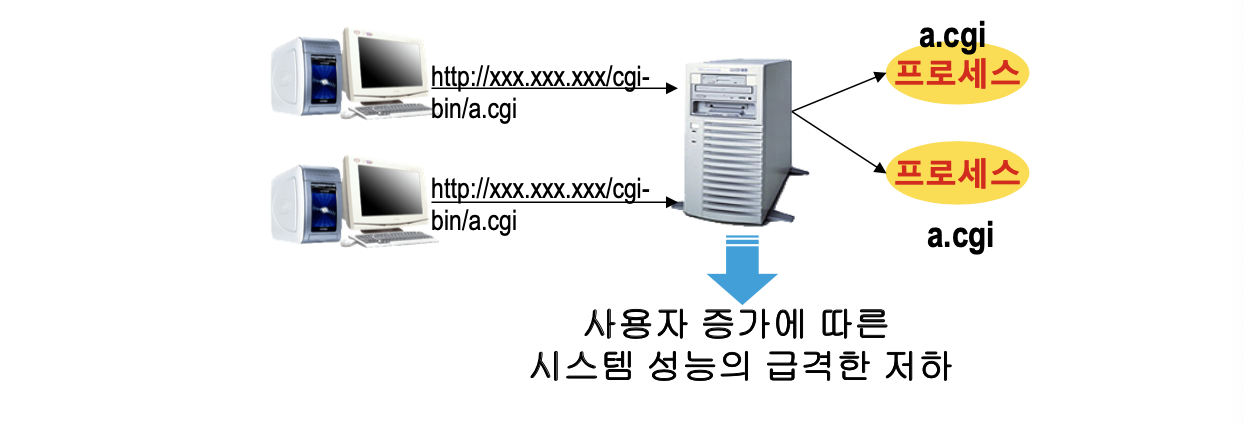 - 프로세스 단위로 실행되기 때문에 사용자 증가시 급격한 성능 저하