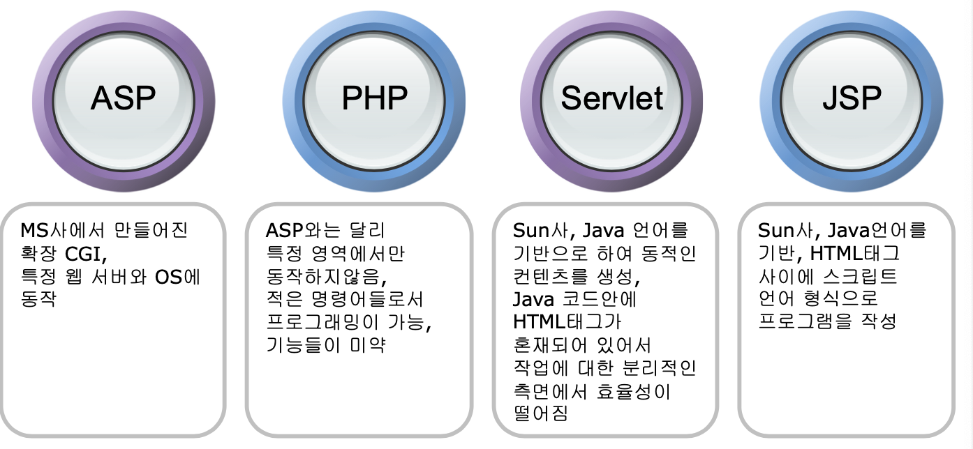 - 동적 페이지: 자동으로 생성된 페이지, 기존의 웹 서버에 새로운 기능을 가진 프로그램을 탑재하여 동적으로 HTML을 생성