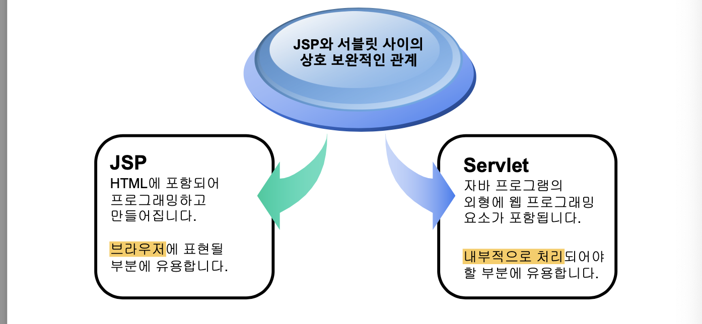 - JSP는 브라우저에 표현이 될 부분에 보다 유용하고 서블릿은 브라우저에 표시될 필요는 없지만 내부적으로 처리되어야 할 부분에 보다 유용하게 사용