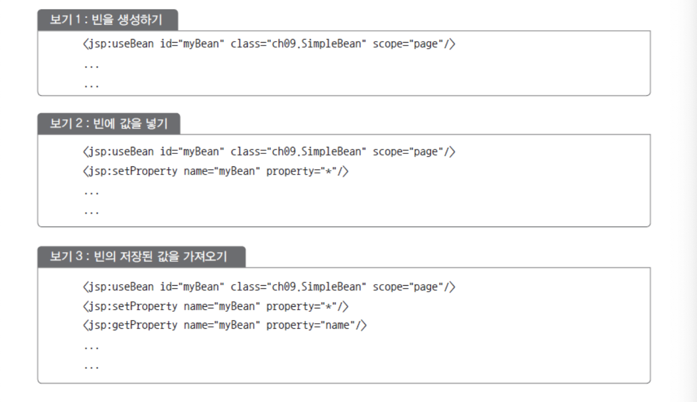 - <jsp:useBean id="..." class="..." scope="..."/> : 빈을 생성하여 둠