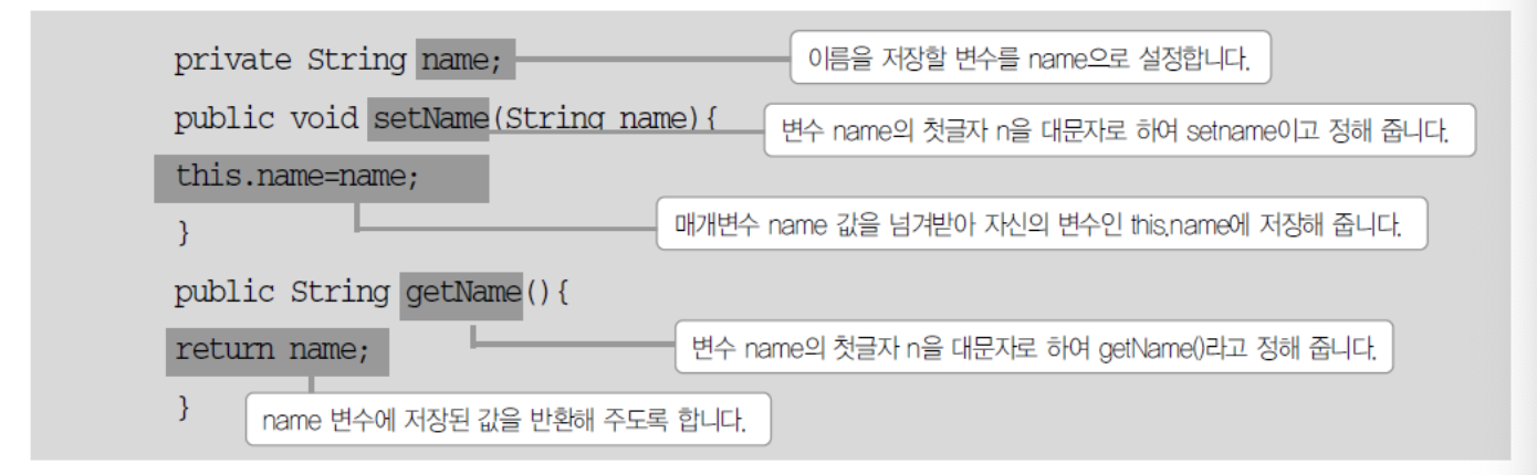 - private로 선언된 변수의 값을 저장하는 메소드를 만듦, 메소드의 이름은 setXxx() 형식으로 만듦 (Xxx는 변수의 이름과 같으며 첫 글자는 대문자)