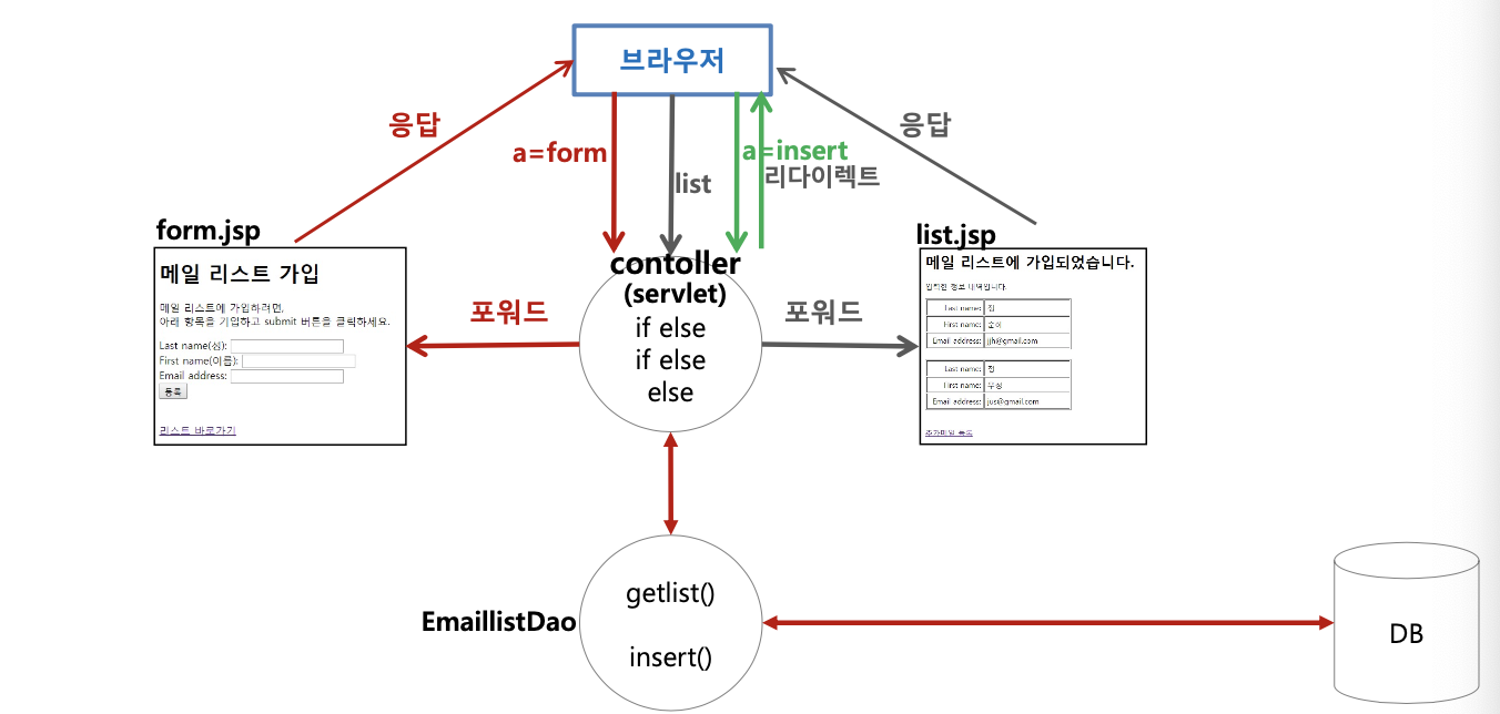 - 요청이 들어오면 처리를 위한 흐름 제어는 controller인 서블릿이 담당함