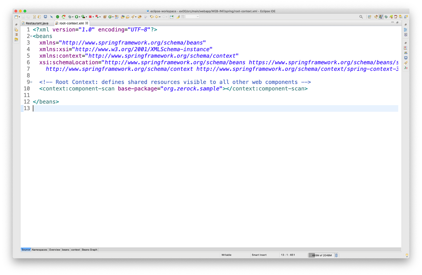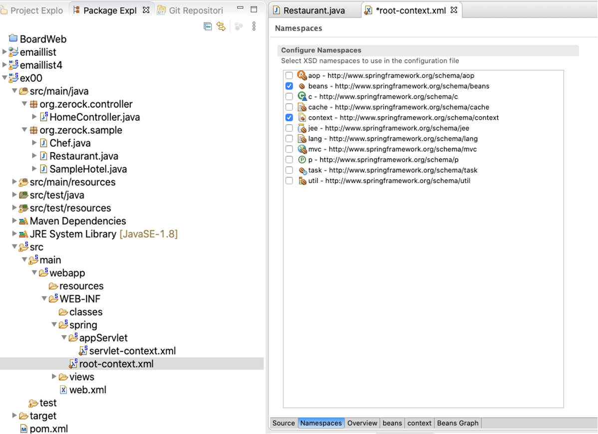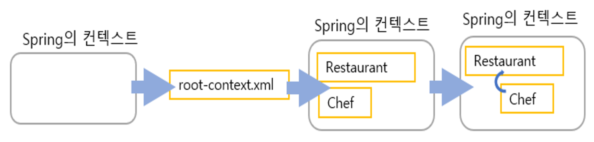 root-context.xml의 설정 내용이 동작하면서 필요한 인스턴스들(beans)을 생성하고 의존 관계를 파악해서 주입시켜 주는 방식