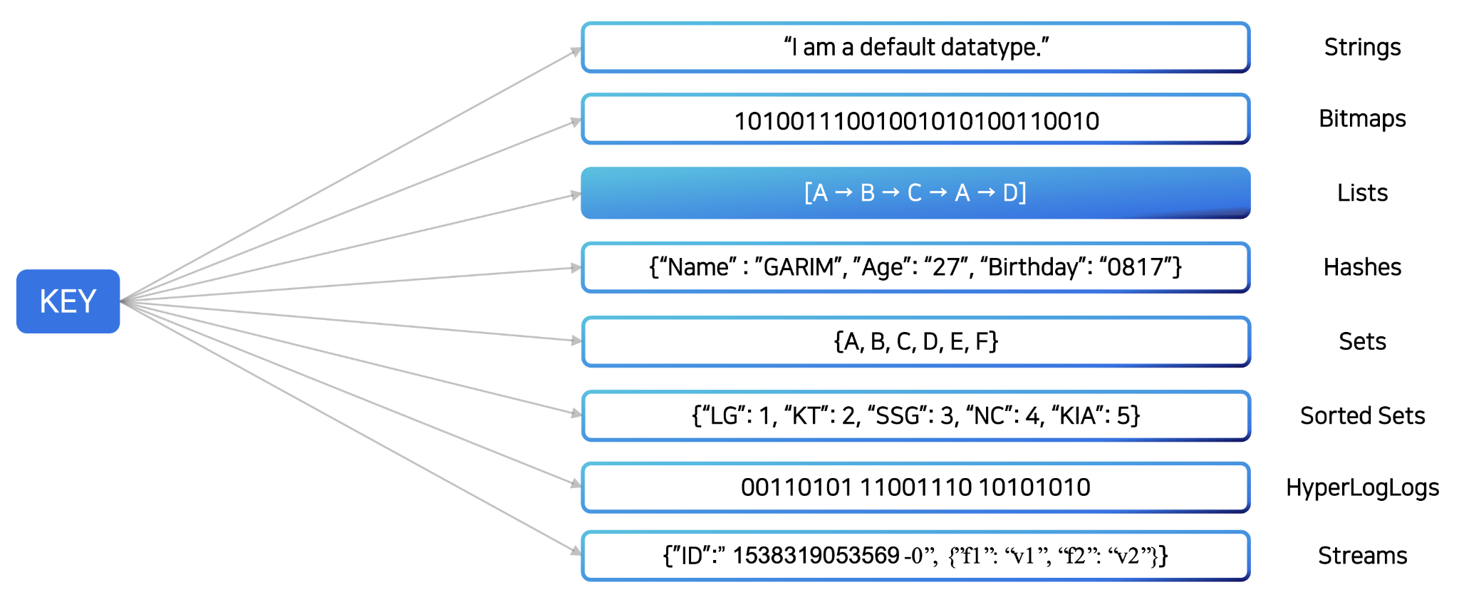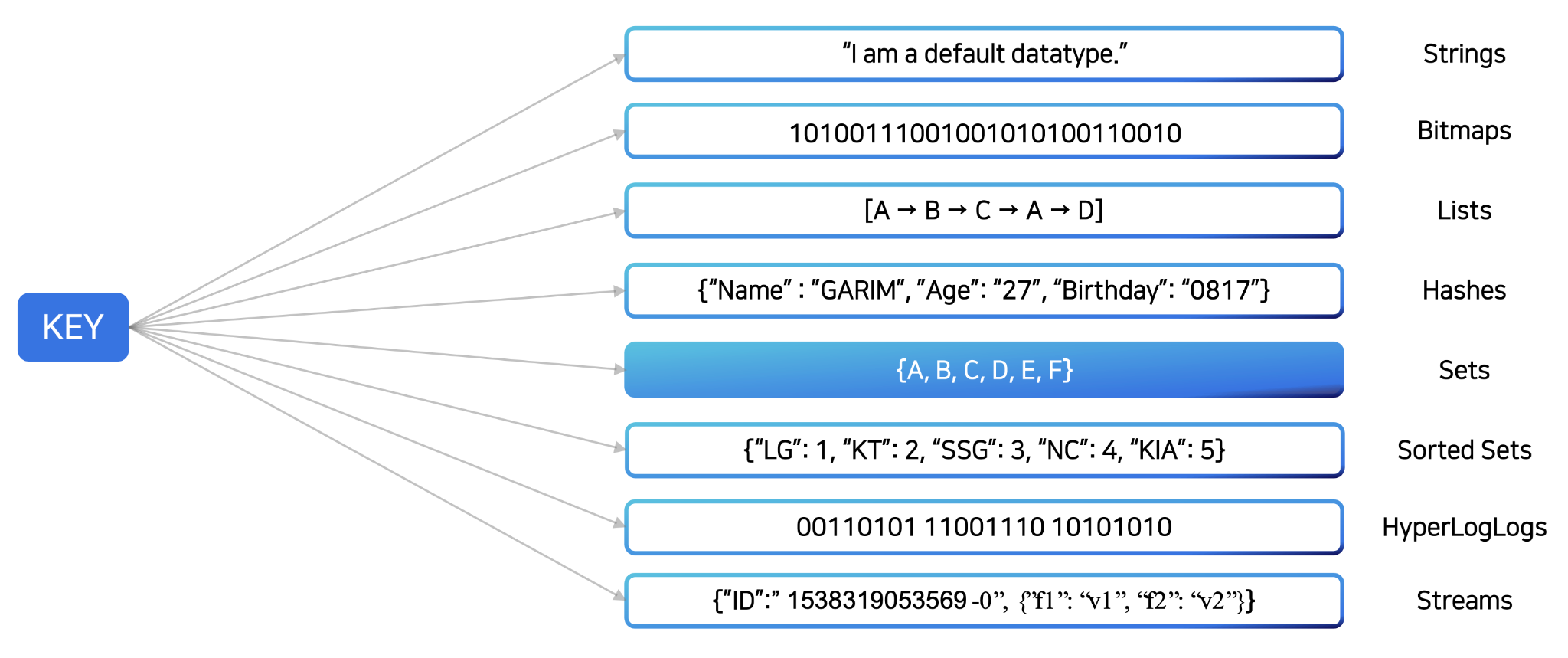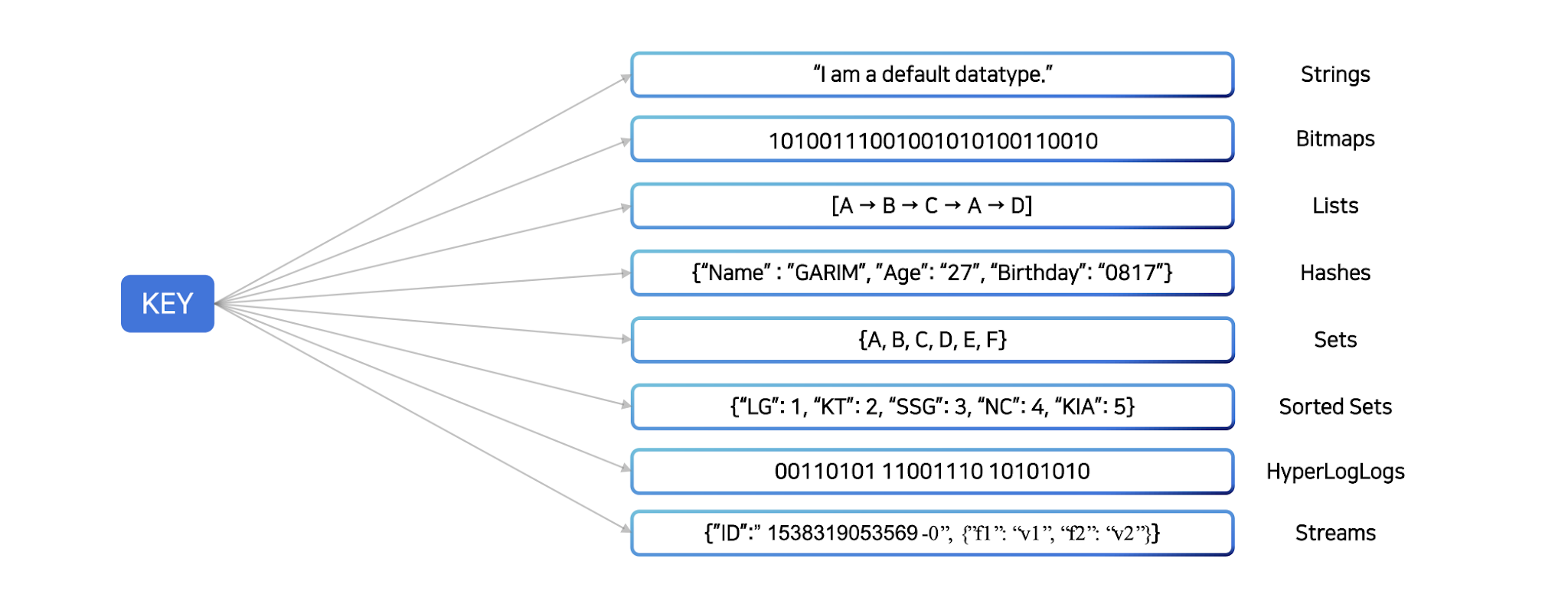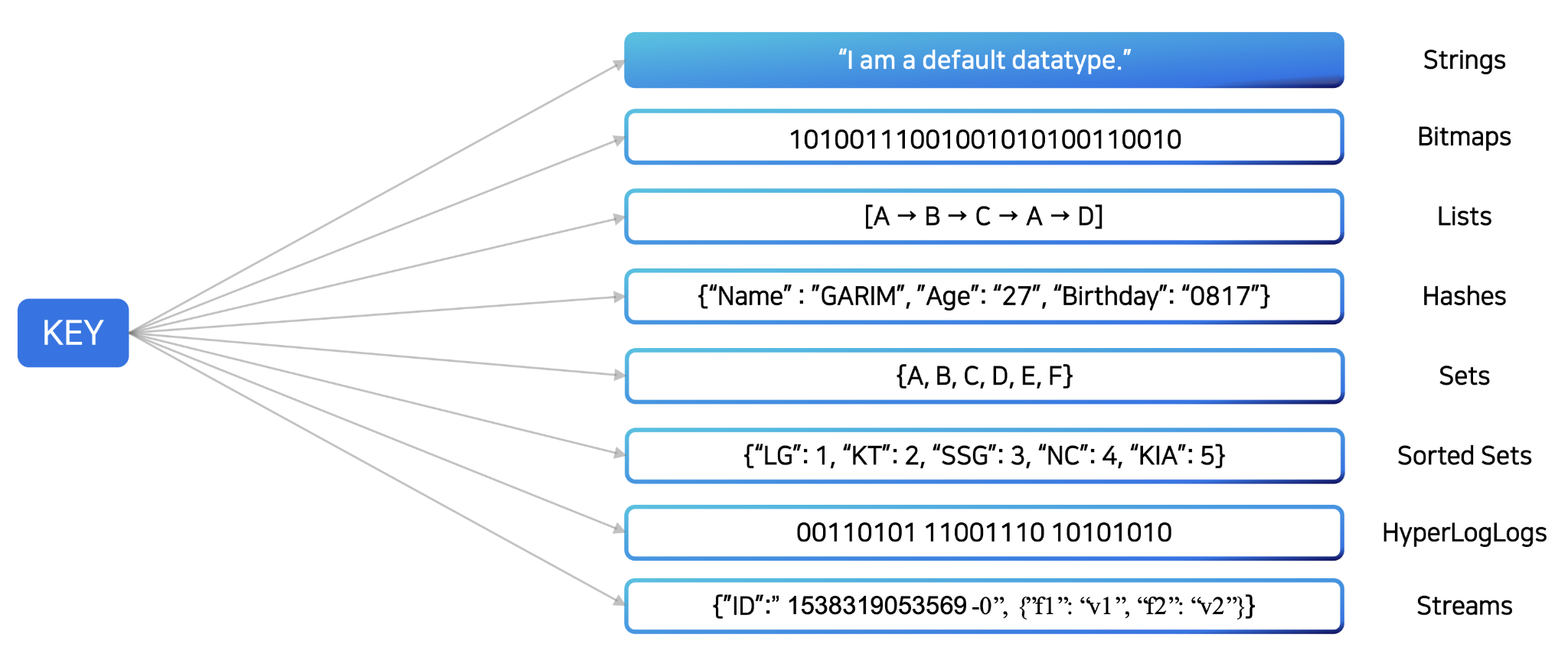 - Value에는 String, Bitmaps, … 등의 컬렉션 타입이 올 수 있음