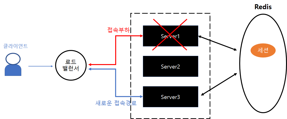 - 서버에서 세션을 Redis 서버로 보내주어 세션을 관리하면 사용자의 서버 접속 경로가 바뀌게 되더라도 세션이 서버에서 관리되지 않고 별도 외부 서버에서 관리되고 있기 때문에 세션이 계속 유지된채로 사용할 수 있음