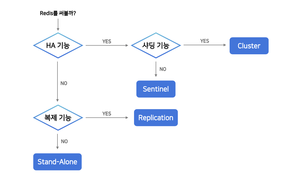 - Sentinel: 센티널 노드 필요, 센티널 노드는 일반 노드들을 모니터링 하는 용도