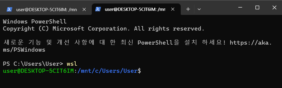 설치가 끝났다면 cmd 창에서 wsl 명령어를 치면 리눅스 환경으로 들어갈 수 있음