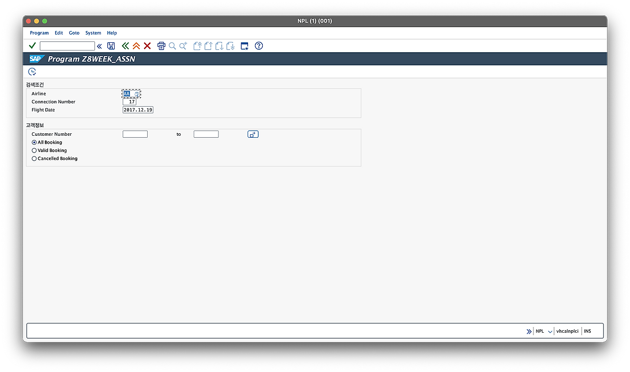 - 파라미터: CARRID(필수 입력/초기값: 'AA'), CONNID(필수 입력/초기값: '0017'), FLDATE(필수 입력/초기값: '20171219')