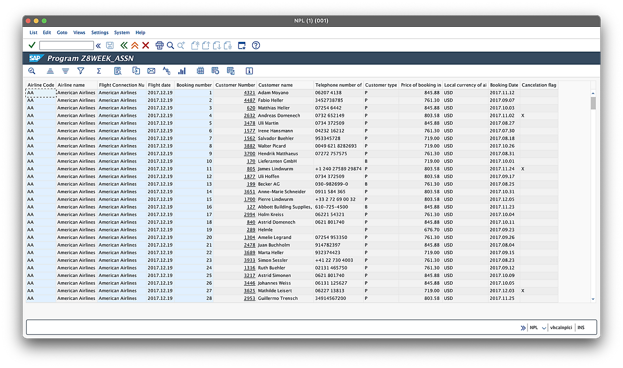 - SBOOK 테이블: CARRID, CONNIDE, FLDATE, BOOKID, CUSTOMID, LOCCURAM, LOCCURKEY, ORDER_DATE, CANCELLED