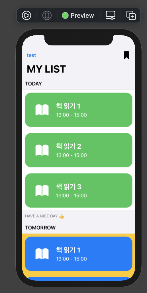 MyProject(icon: "book.fill", title: "책 읽기", start: "14:00", end: "16:00", bgColor: Color.green)