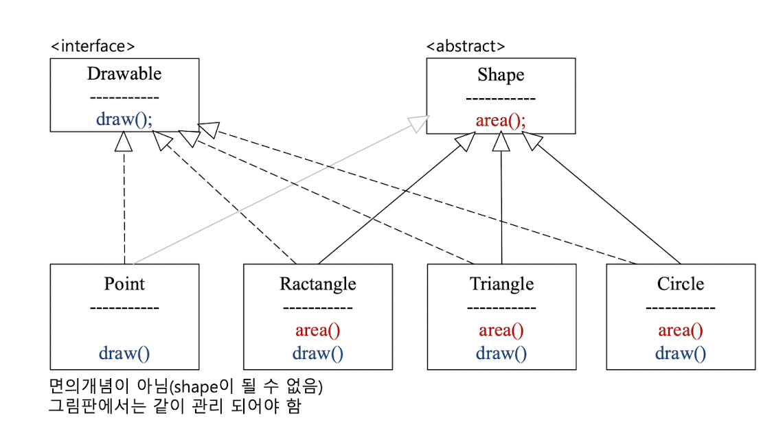 예시 (Circle은 Shape 클래스를 상속받으면서 동시에 Drawable 인터페이스를 구현)