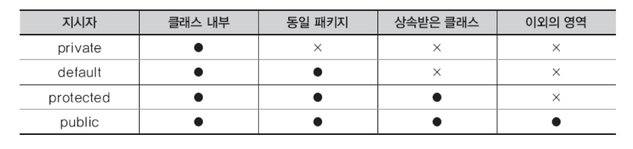 - 접근 제한자를 사용해서 객체의 필드와 메소드의 사용범위를 제한하게 됨