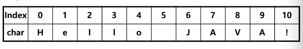 - String 객체 내의 문자 인덱싱은 배열과 같이 0부터 시작됨