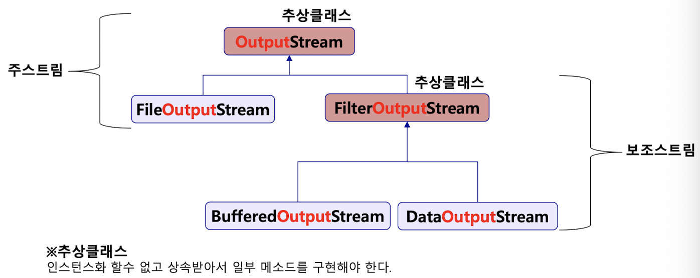 - OutputStream (바이트 스트림: Byte Stream): 1과 0으로 구성된 Binary 데이터의 출력 처리를 위한 스트림 (이미지, 사운드)