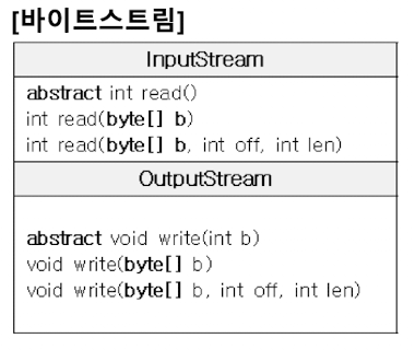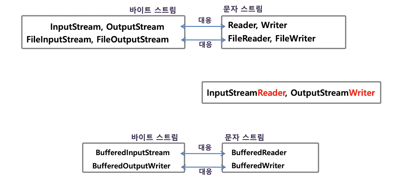 - 바이트 스트림(Bytem Stream): 1과 0으로 구성된 Binary 데이터의 입출력 처리를 위한 스트림 (이미지, 사운드)