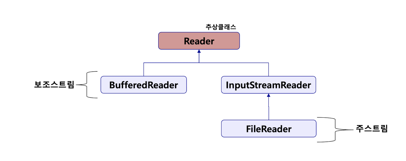- Reader (문자 스트림: Character Stream): 문자, 텍스트 형태의 데이터 입력 처리를 위한 스트림(텍스트, 웹페이지, 키보드 등)