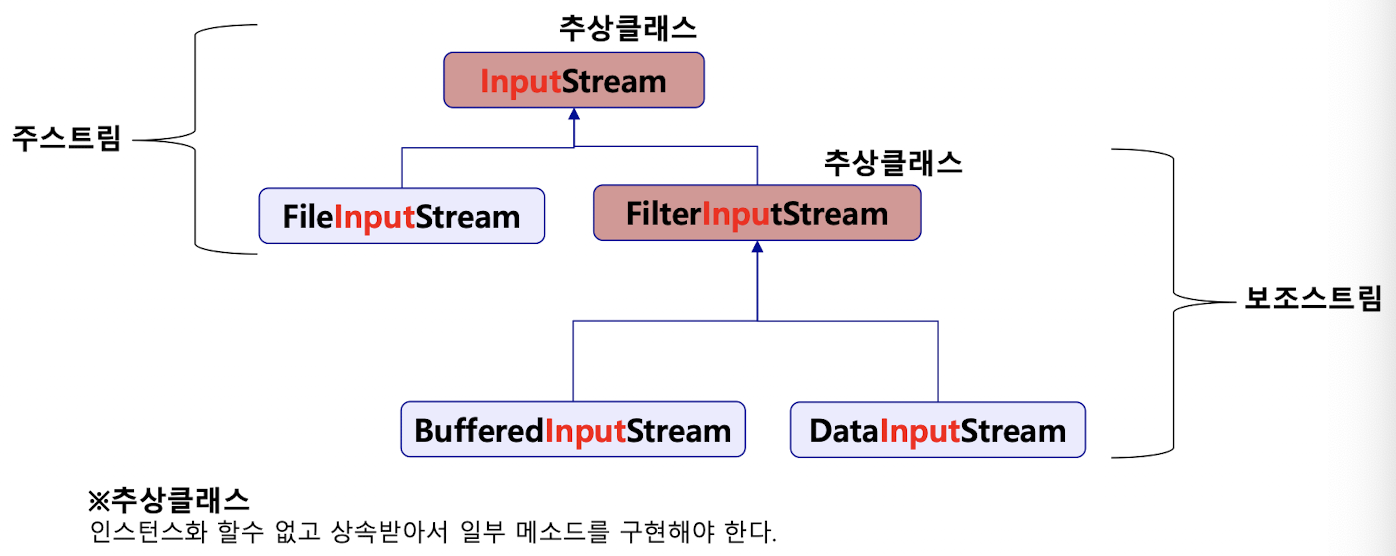 - InputStream (바이트 스트림: Byte Stream): 1과 0으로 구성된 Binary 데이터의 입력처리를 위한 스트림(이미지, 사운드)