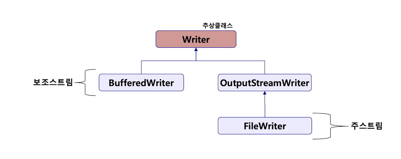 - Writer (문자 스트림: Character Stream): 문자, 텍스트 형태의 데이터 출력 처리를 위한 스트림(텍스트, 웹페이지, 키보드)
