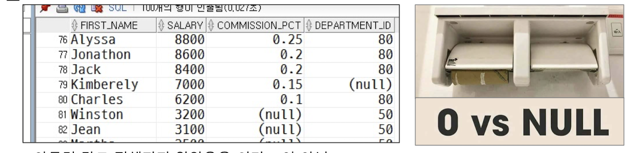 commissiion_pct가 null 값이므로 salary*commission_pct도 null